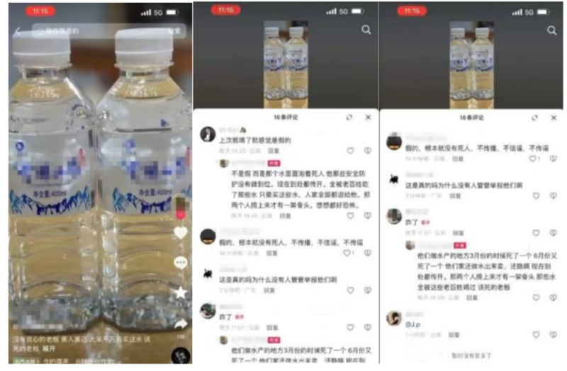 近日,云南临沧网警工作中掌握:有网民在网络平台发布某品牌矿泉水的视频,并在评论区公然造谣称 “这家矿泉水厂今年 3月份死了一个人,6月份又死了一个,那两个人捞上来的时候只剩一架骨头,那些水全被老百姓喝了”,引发大量网民关注和讨论,并造成当地消费者恐慌。