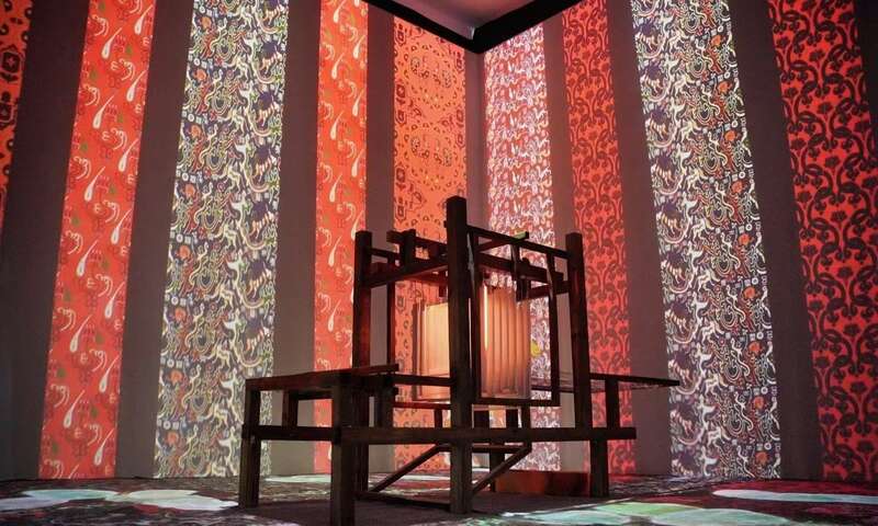 光禹莱特带来的数字作品《织造锦梦》,融入蜀锦、艾德莱斯绸、霍尔青纹样等非遗项目与纹样。其中既有以“五星出东方利中国”等为代表的汉晋蜀锦纹样,也加入新疆特色霍尔青纹样和艾德莱斯绸相关纹样。数字作品还将互动体验延伸到了地面:当观众走进展厅,只需脚尖轻触,和田美玉的图样在地上便化作清流,流向四海。
