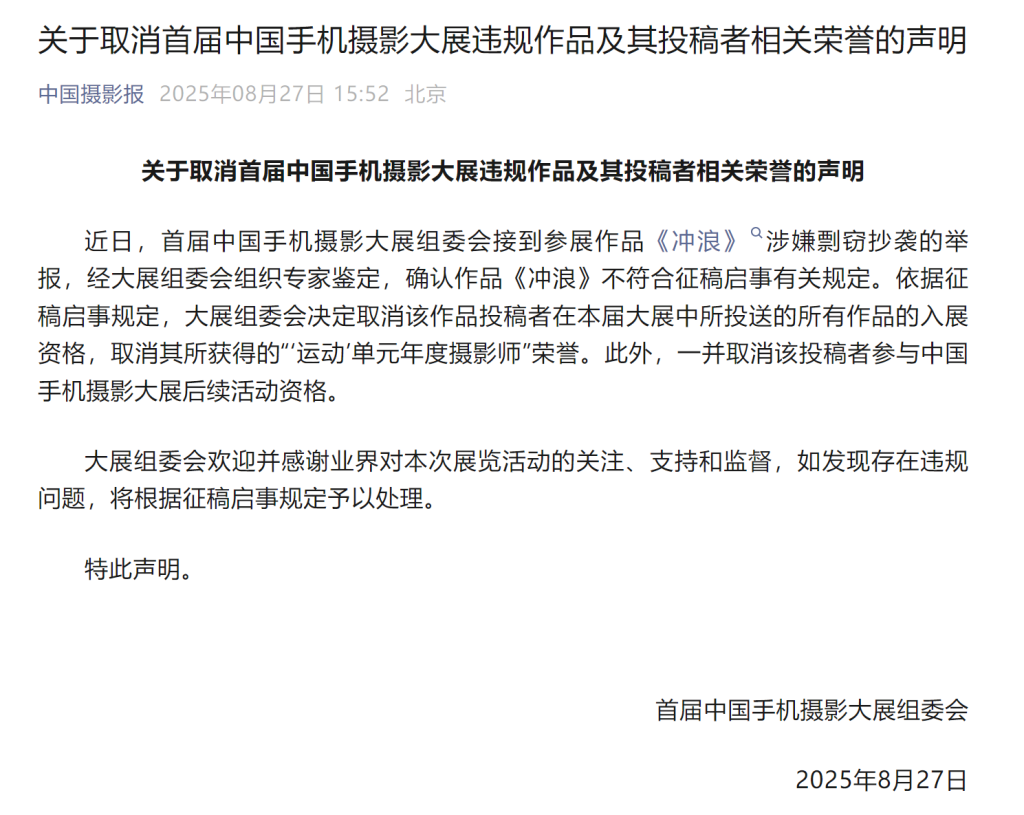 2025年8月27日,首届中国手机摄影大展组委会发布《关于取消首届中国手机摄影大展违规作品及其投稿者相关荣誉的声明》:取消参展作品《冲浪》所获得的“‘运动’单元年度摄影师”荣誉,并一并取消该投稿者参与中国手机摄影大展后续活动资格。