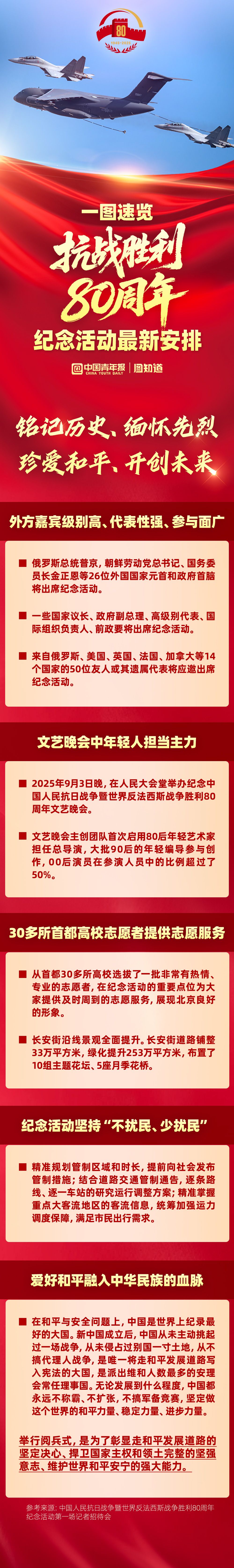 普京、金正恩等26位外国国家元首和政府首脑将出席中国人民抗日战争暨世界反法西斯战争胜利80周年纪念活动。纪念活动还有哪些最新安排,一图了解。