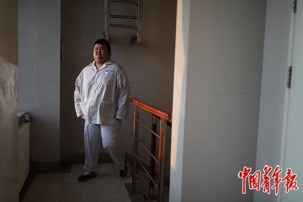 来自山东济南商河县的马文亮特意带儿子马振旭来到北京,参加解放军总医院第二医学中心健康医学科的家庭减重营。17岁的振旭即将上高二,身高1.81米的他体重最高时近300斤。马文亮工作忙,经常去外地出差,孩子从小由家里老人带大。老人总担心振旭吃不饱,有时明明吃过了晚餐,睡觉前还会把他叫起来“再喂一顿”,逐渐让他养成了过量饮食的习惯。睡眠监测仪显示,振旭一晚9228次呼吸里有6792次打鼾,肥胖问题已严重影响他的睡眠质量和身体健康。在康复师姚丽莎的带领下,振旭跟父亲一起学习“大体重”情况下正确的训练方式,不一会儿就气喘吁吁,大颗的汗珠从脸颊流下。