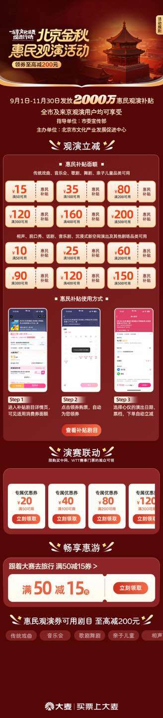 此次活动由市委宣传部指导,北京市文化产业促进中心主办,活动时间为9月1日至11月30日,全市剧场类演出项目折扣基础上叠加惠民观演补贴,市民可通过大麦APP和小程序参与到形式多样的优惠活动,具体优惠如下: