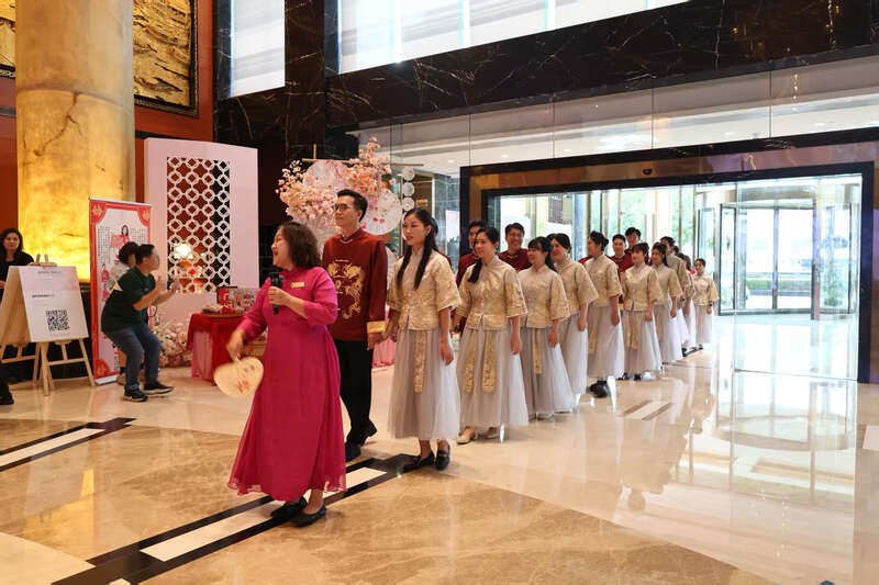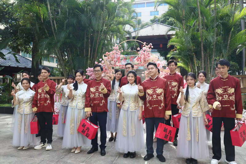 此次集体婚礼采用“婚俗文化+非遗+公益”的模式,融合婚俗改革的时代理念、甜蜜经济的活力与非遗的独特魅力。大妗姐引导、喝合卺酒、颁授婚书……一道道中国传统婚庆礼俗轮番上演。现场,一场极具岭南特色的集体婚礼随即展开,新人们在亲朋好友的见证下行传统礼俗。“这次的中式传统婚礼让我们感受到了传统礼俗的魅力,非常难忘且有意义。”参与集体婚礼的新人罗润杰与冯晔莹说道。