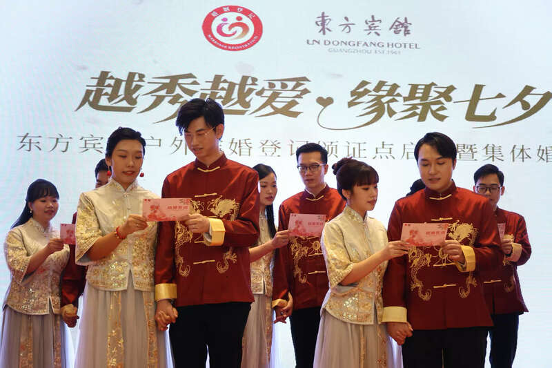 中国青年报客户端讯(冯子敏 中青报·中青网记者 林洁)8月29日,恰逢七夕佳节,“越秀越爱甜蜜联盟”在广州市越秀区东方宾馆成立。当天,东方宾馆结婚登记户外颁证点启动并举行集体婚礼活动,10对新人一同参与中国传统婚礼仪式。