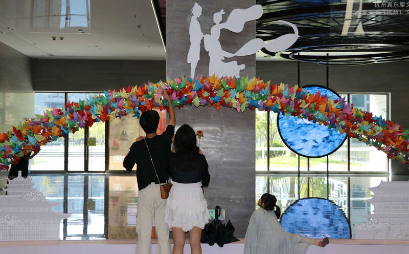 青年人把写有祝福的纸鹤、喜鹊搭在“鹊桥”。 主办方 /供图