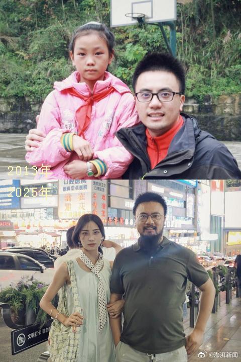合影中的两位主人公,当年系着红领巾、神色拘谨的小姑娘何银,如今已经成长为一名美丽的大姑娘、一位优秀的支教老师;而曾经年轻帅气,蹲下与孩子亲切合影的大哥哥陈康,如今依稀可见神采飞扬,却多了些中年发福的意味。强烈的对比让人不禁感叹:岁月不仅催人俏,也是一把“杀猪刀”。但同时又令人欣慰,“我长大后,终于追上了你的背影,成为了你的模样”。
