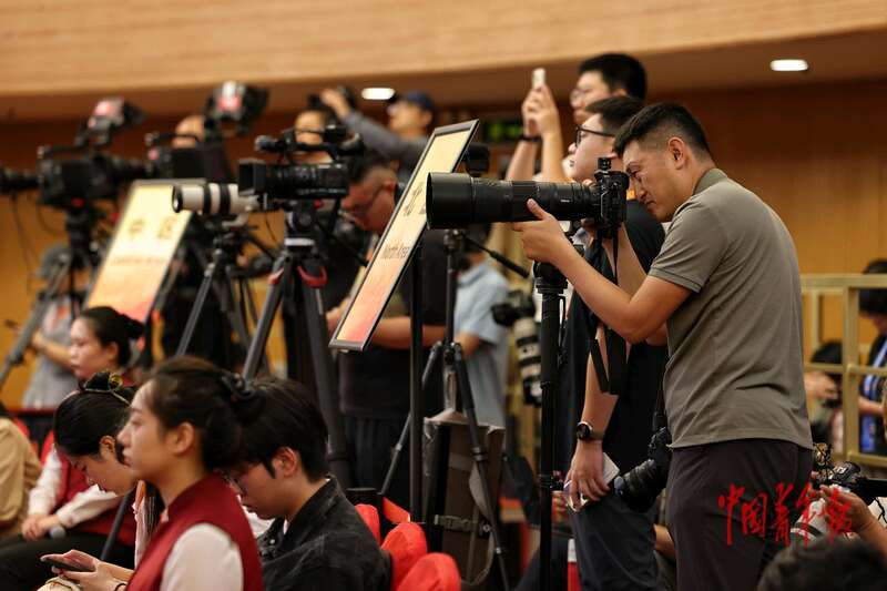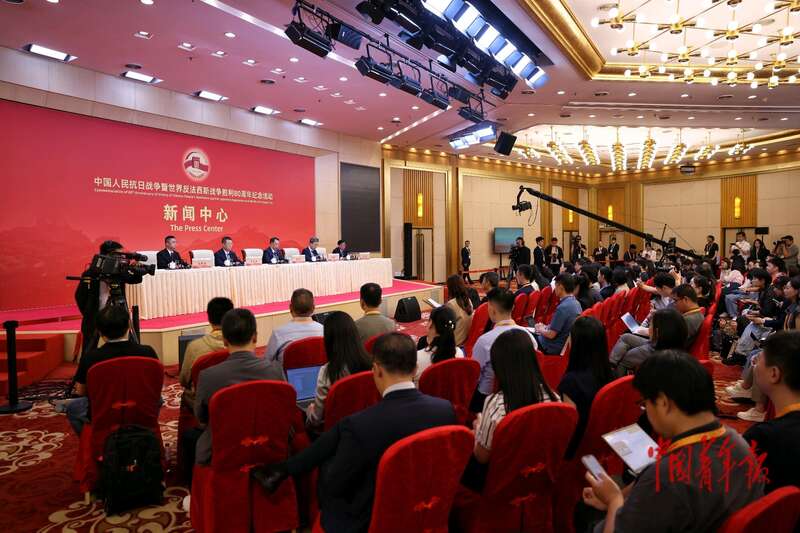8月31日,北京梅地亚中心,中国人民抗日战争暨世界反法西斯战争胜利80周年纪念活动新闻中心举办第三场记者招待会,记者在现场拍摄记录。中青报•中青网记者 曲俊燕/摄