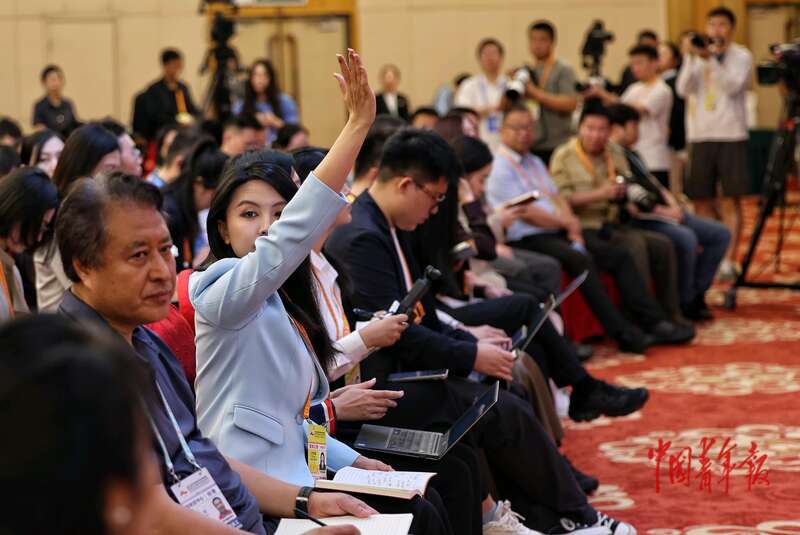 8月31日,北京梅地亚中心,中国人民抗日战争暨世界反法西斯战争胜利80周年纪念活动新闻中心举办第三场记者招待会,一名记者举手提问。中青报•中青网记者 曲俊燕/摄