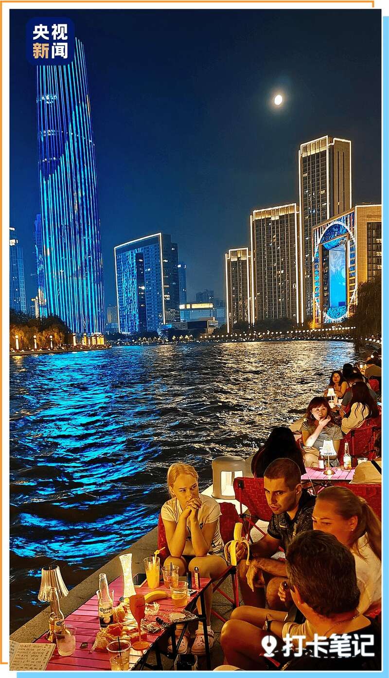 灯光亮起,游船从桥下缓缓驶过,岸边码出了躺椅和小摊。微风吹过,带走了燥热,留下人们满脸的惬意与舒爽。