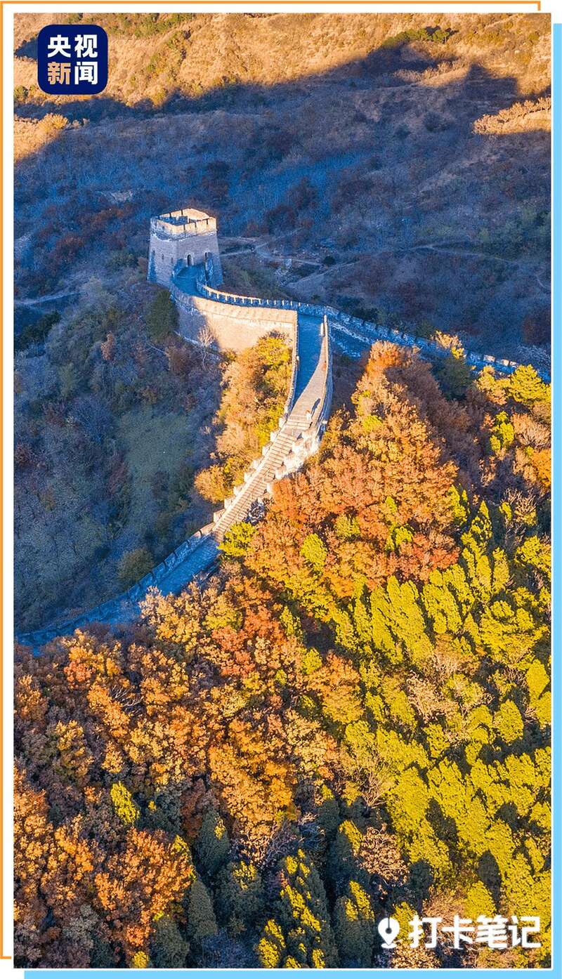 秋天来,看层林尽染,长城在夕阳中散发金光。
