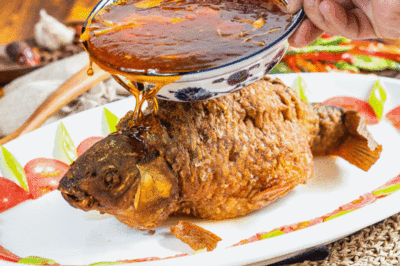天津有道名菜罾(zēng)蹦鲤鱼,鱼炸至酥脆后,趁热浇上一层酸甜的糖醋酱汁,香味四溢,外酥里嫩,鱼肉入口即化。