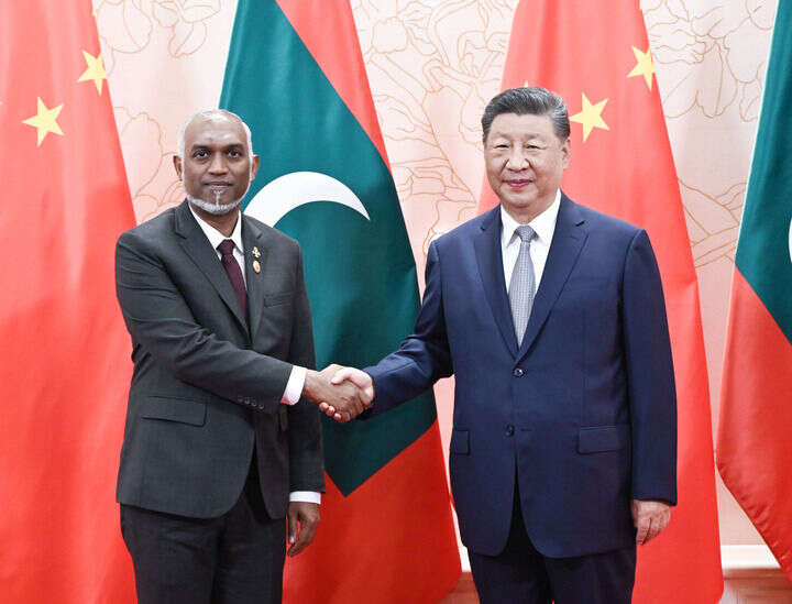 8月31日上午,国家主席习近平在天津迎宾馆会见来华出席2025年上海合作组织峰会和纪念中国人民抗日战争暨世界反法西斯战争胜利80周年活动的马尔代夫总统穆伊兹。新华社记者 岳月伟 摄