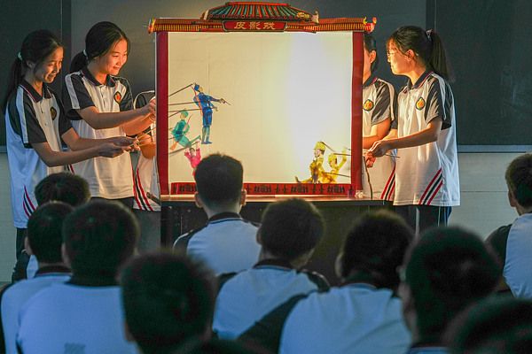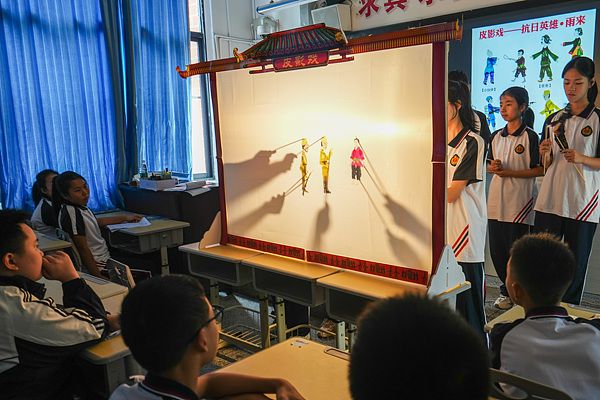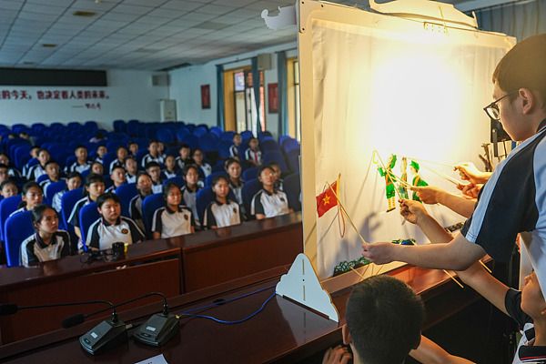 2025年9月1日,四川眉山,彭山区文化馆将“非遗皮影戏”送进彭山区第三中学“开学第一课”课堂,皮影戏社团的同学们正在表演展示《抗日英雄·雨来》的故事。