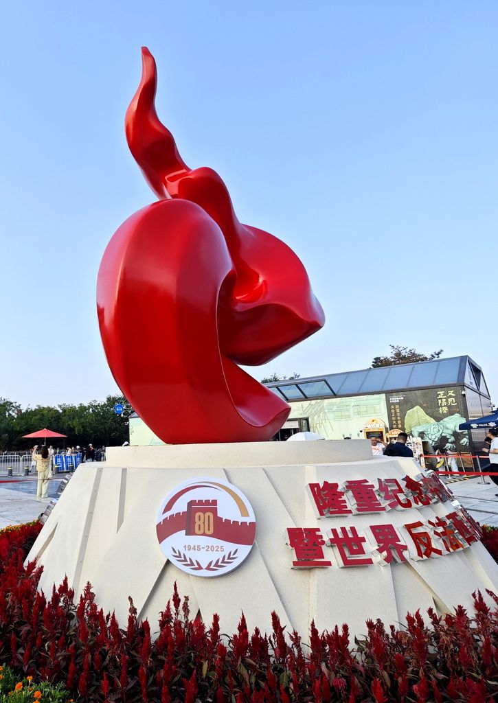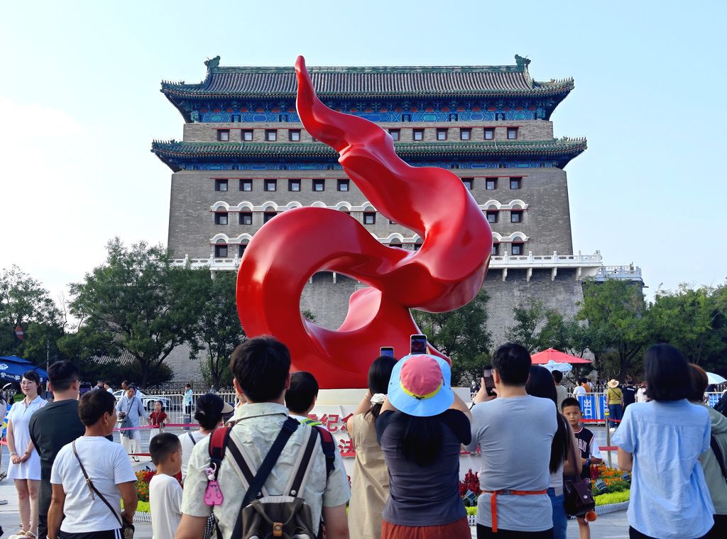 2025年9月1日,北京前门大街,中国人民抗战胜利80周年纪念雕塑。