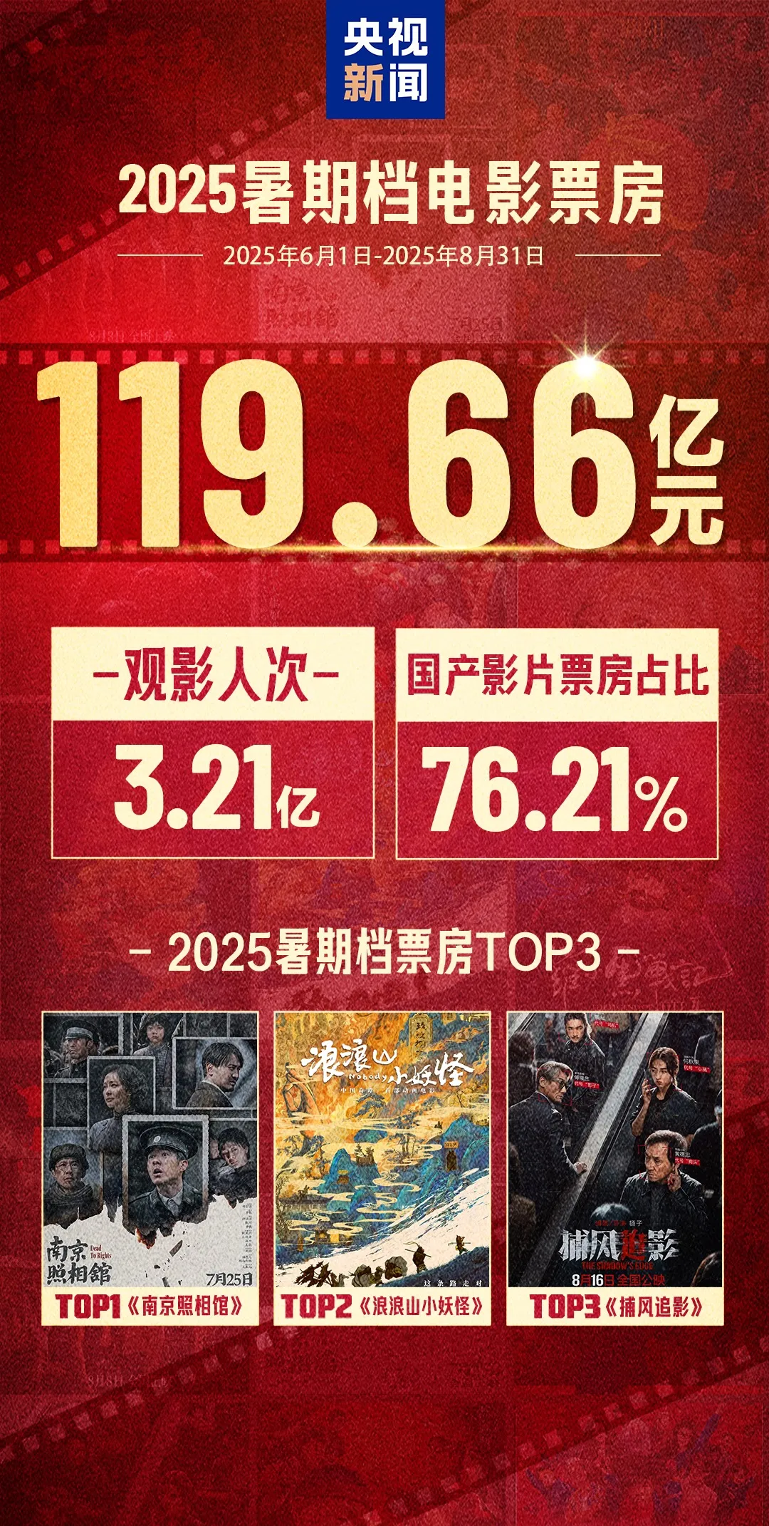 根据国家电影局统计,2025年暑期档(6月1日至8月31日)电影票房为119.66亿元,观影人次为3.21亿,同比分别增长2.76%和12.75%,国产影片票房占比为76.21%,超过去年同档期。