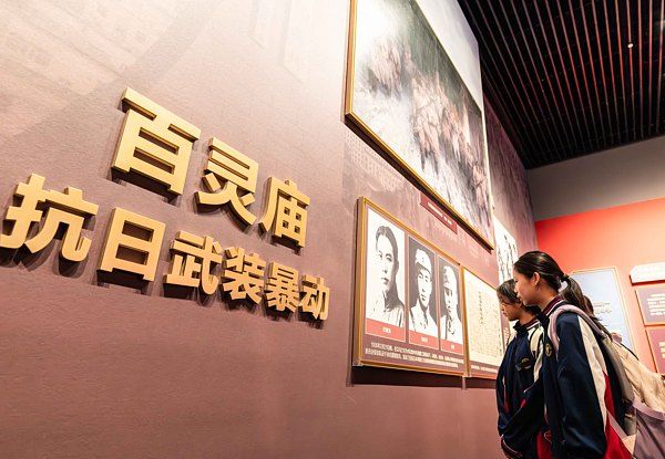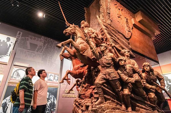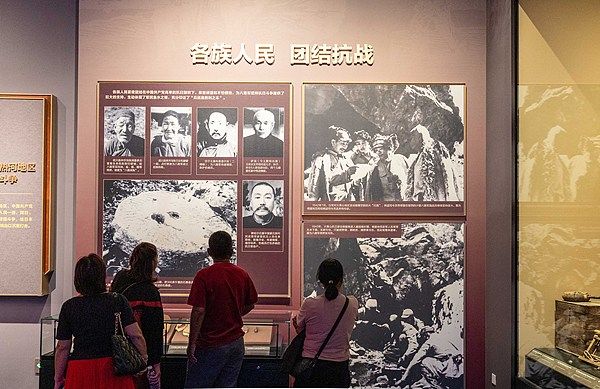 2025年9月2日,呼和浩特,观众在内蒙古博物院《解放之路——内蒙古革命史陈列》展厅“抗日烽火”展区驻足参观。