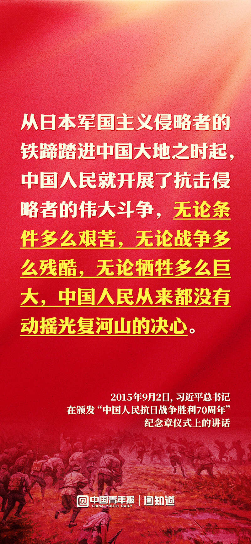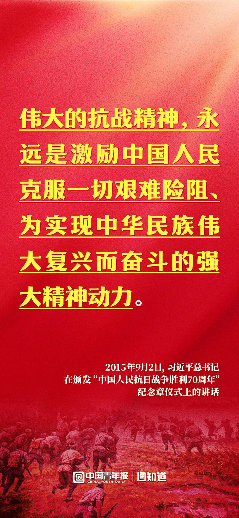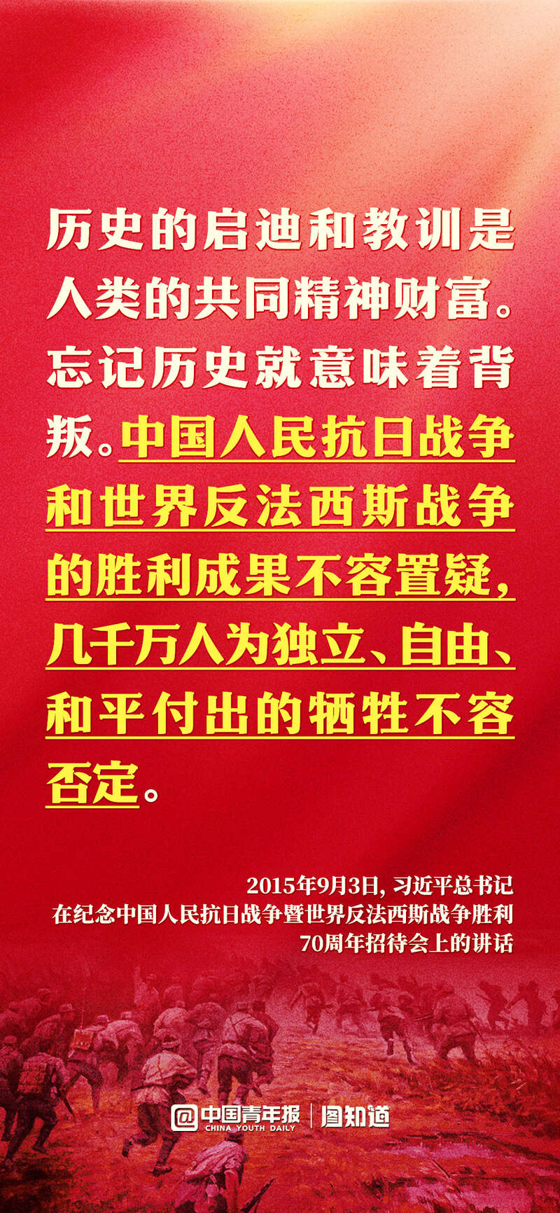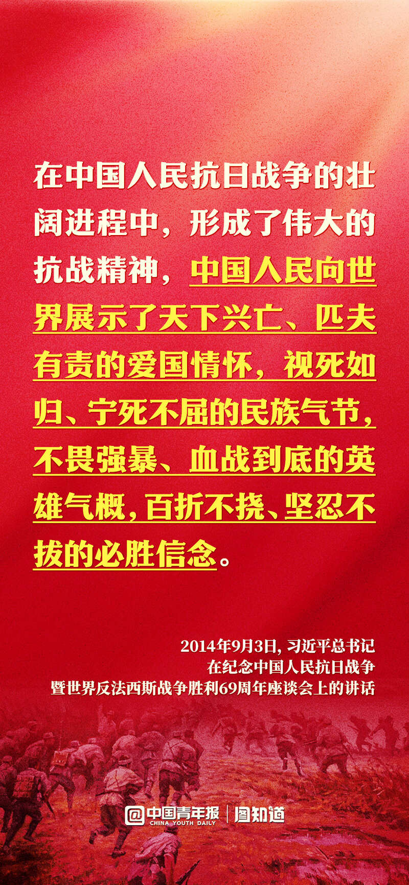 中国青年报客户端 | 2025-09-02 14:09今年是中国人民抗日战争暨世界反法西斯战争胜利80周年。今天的我们,如何理解抗战精神,如何正确看待历史?习近平总书记的话语指明了方向,一起学习。