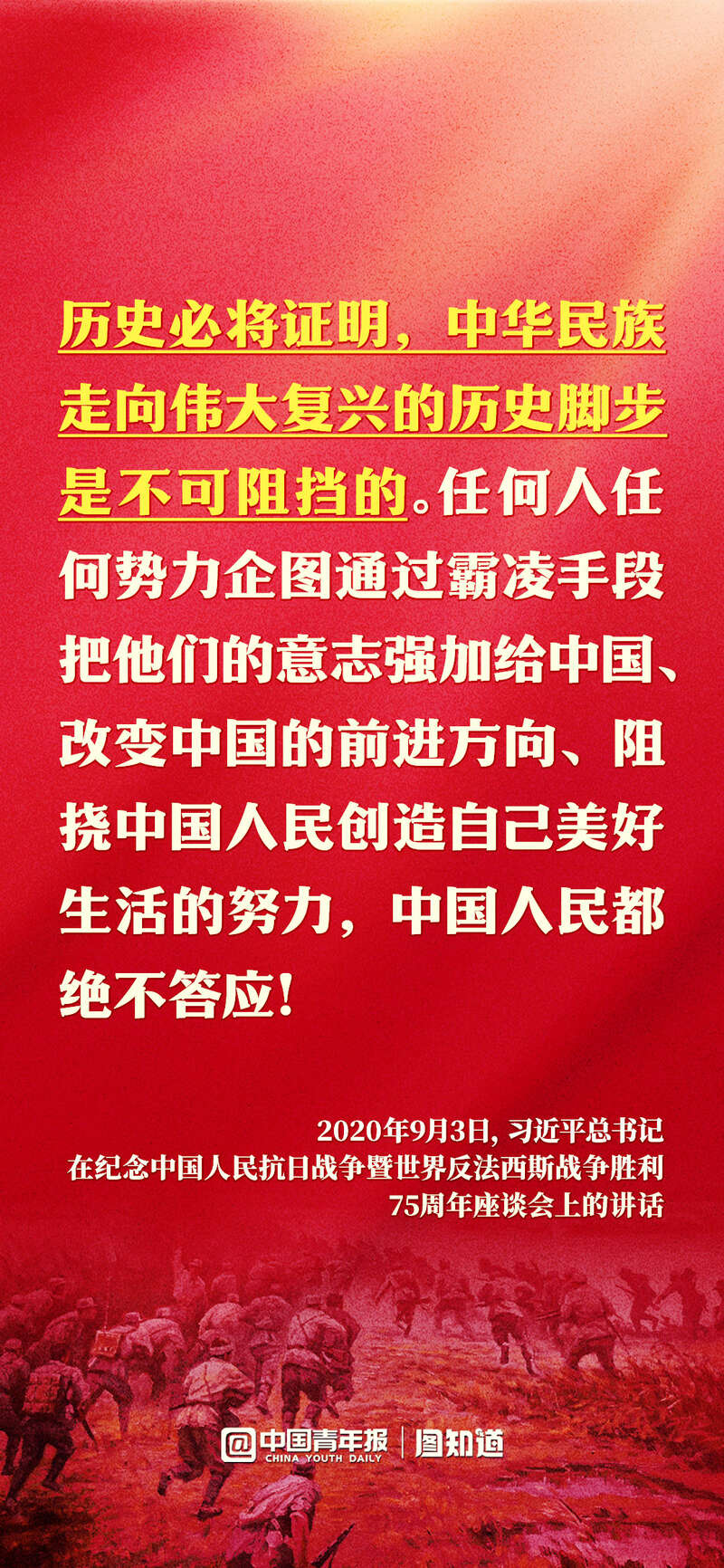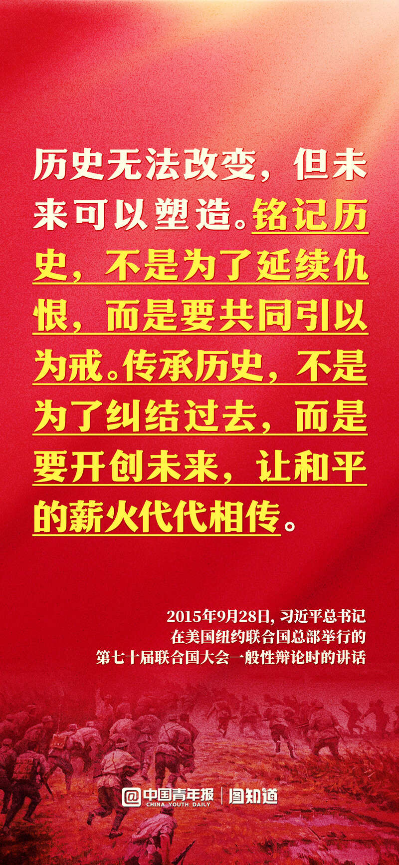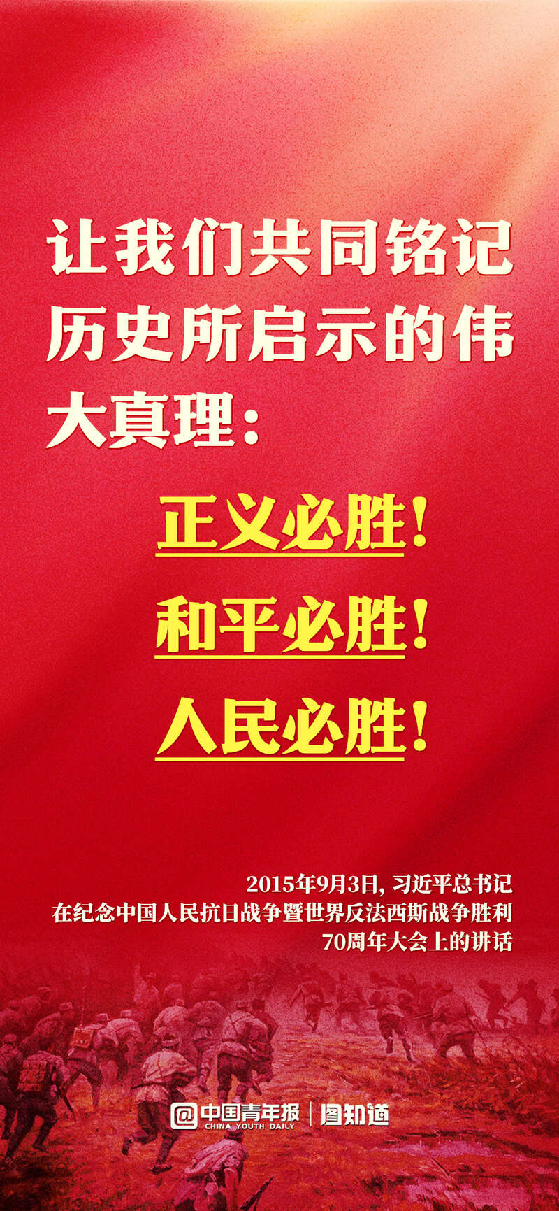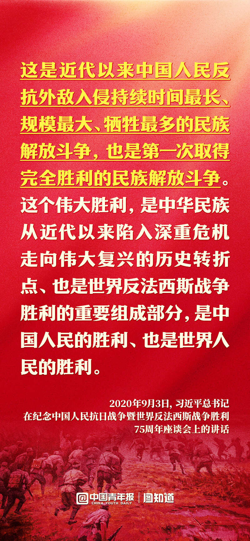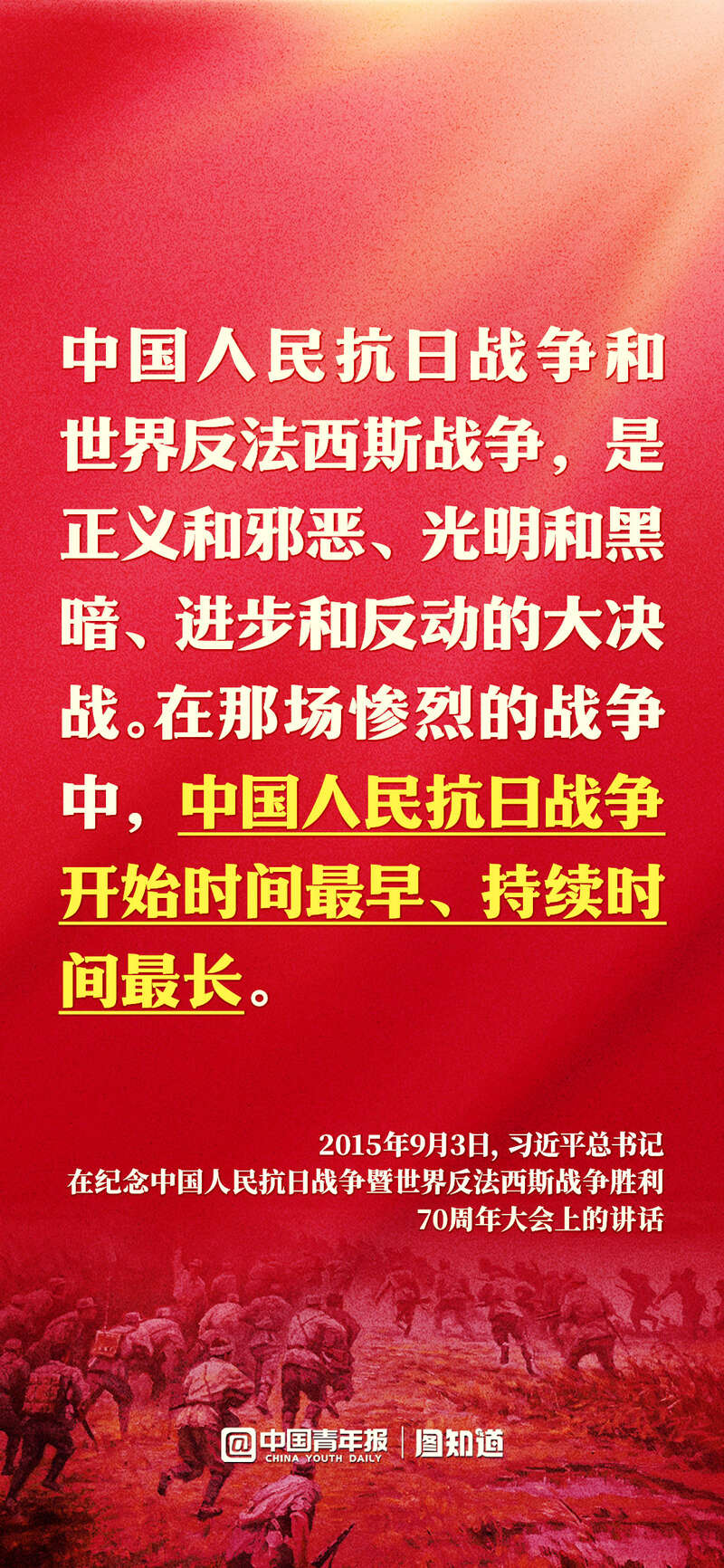 中国青年报客户端 | 2025-09-02 14:09今年是中国人民抗日战争暨世界反法西斯战争胜利80周年。今天的我们,如何理解抗战精神,如何正确看待历史?习近平总书记的话语指明了方向,一起学习。