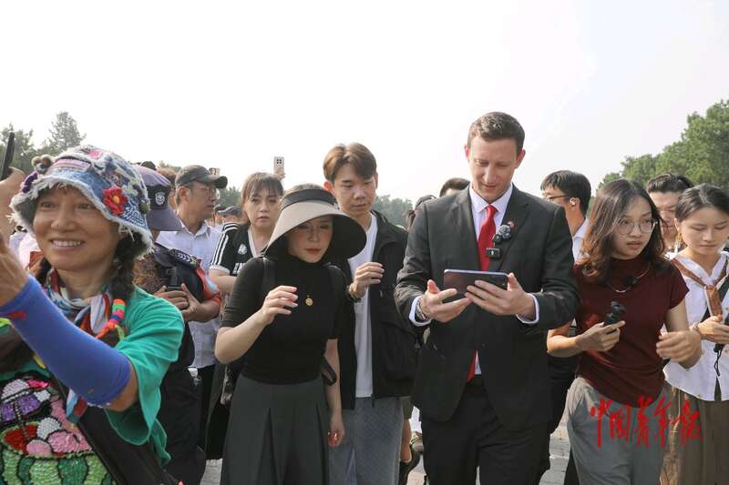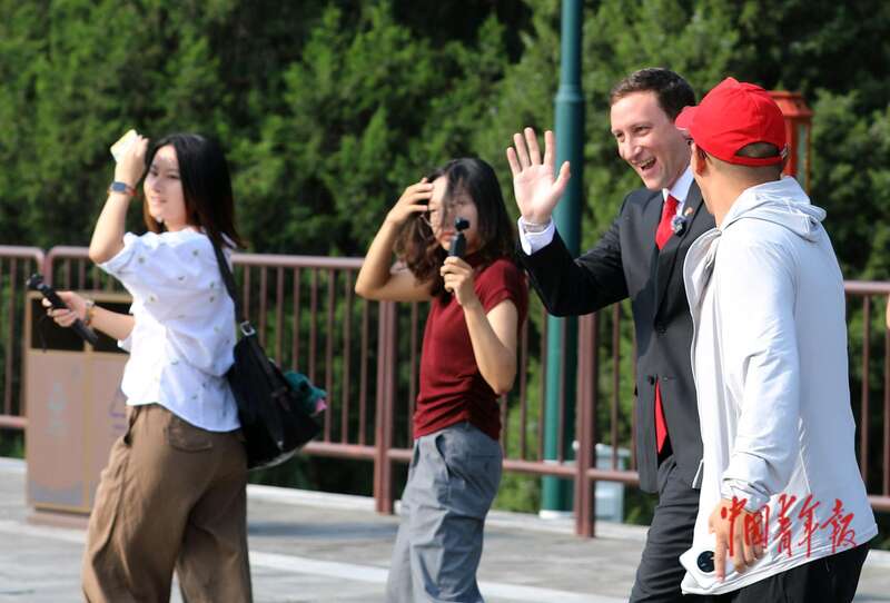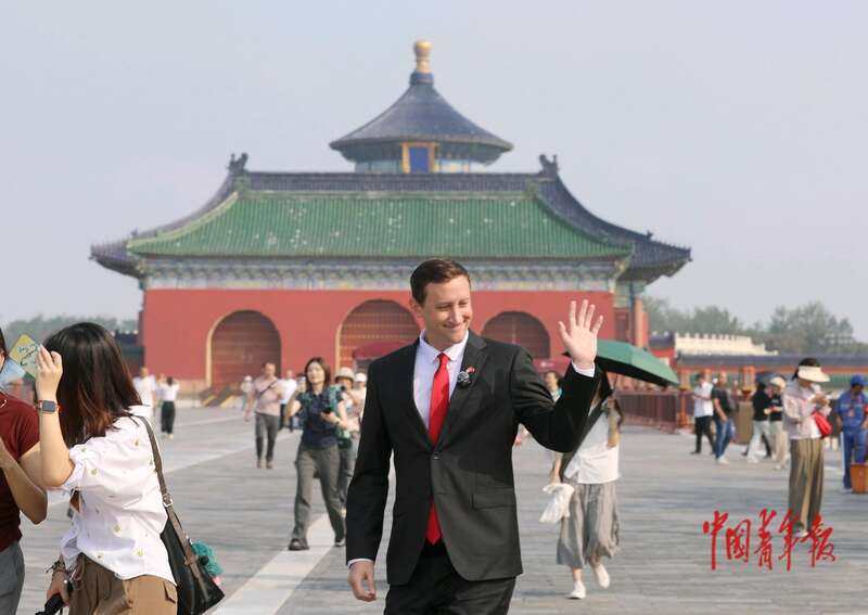 9月3日,北京天坛公园,美国友人埃文·凯尔向游客打招呼。中青报·中青网记者 陈剑/摄