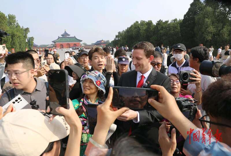 9月3日,北京天坛公园,美国友人埃文·凯尔和中国游客一起合影留念。当天是中国人民抗日战争暨世界反法西斯战争胜利80周年纪念日,不少市民和游客聚在祈年殿南边的丹陛桥等待观看纪念中国人民抗日战争暨世界反法西斯战争胜利80周年大会受阅空中梯队的飞过。美国友人埃文·凯尔也来到这里,被中国游客认出,吸引了群众的围观,人们纷纷向他问好,埃文·凯尔也向大家问好,感谢中国人民的善意和支持。据了解,埃文·凯尔出生于1989年,美国籍国际友人,中国外交国礼瓷获得者。这位美国青年曾向中国无偿捐献二战相册,在中国颇有知名度。中青报·中青网记者 陈剑/摄