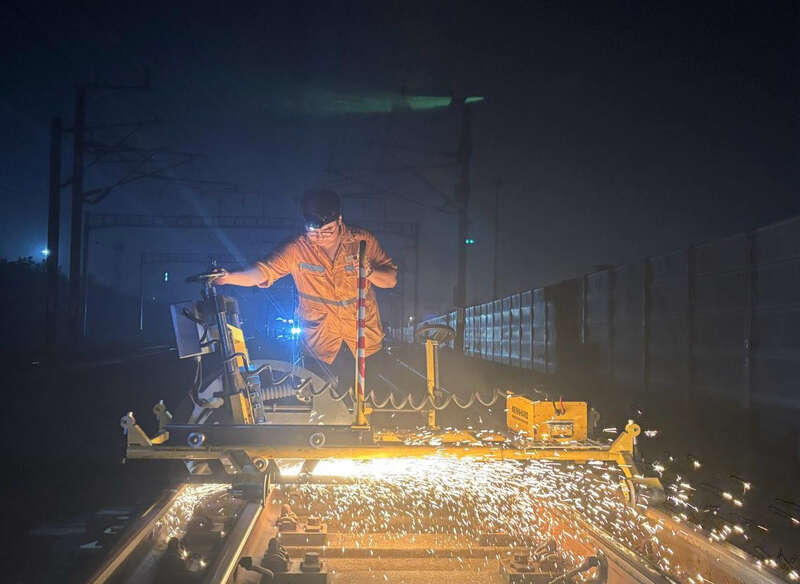 中国青年报客户端讯(中青报·中青网记者 李剑平 通讯员 陈涛)近日,中国铁路上海局集团有限公司上海高铁基础设施段00后职工翟登凯推着钢轨打磨机,在沪宁城际常州站通宵对车站内的道岔进行打磨作业。现场迸发的“铁花”,在夜色中绽放。今年暑运以来,上海高铁基础设施段持续开展线路养护作业,累计完成47组道岔、29公里线路的钢轨打磨任务,以精益求精的精神,提升旅客乘车舒适度和安全性。