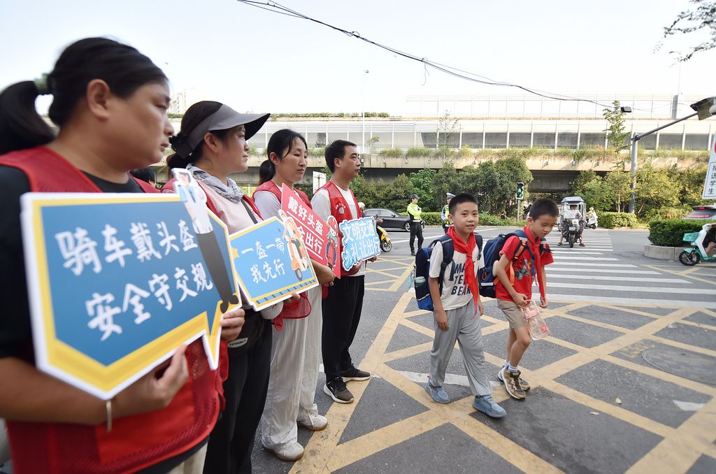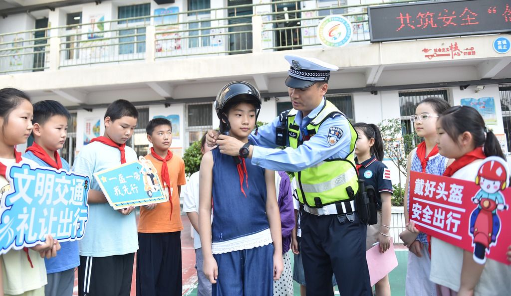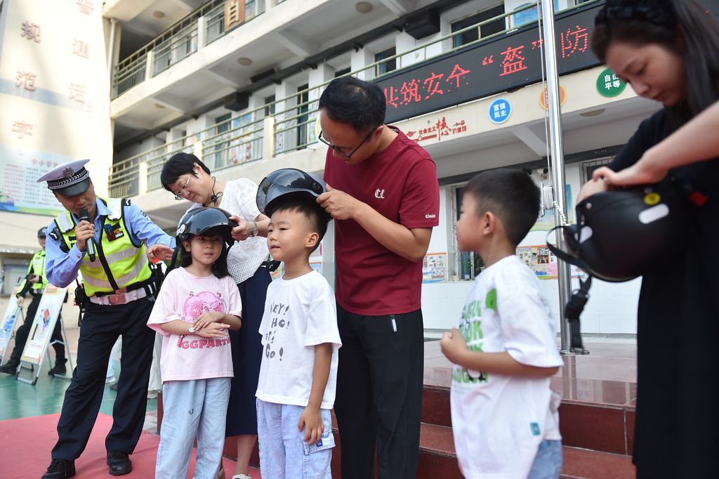 2025年9月4日,安徽合肥,四河小学交警指导家长正确为孩子佩戴头盔。