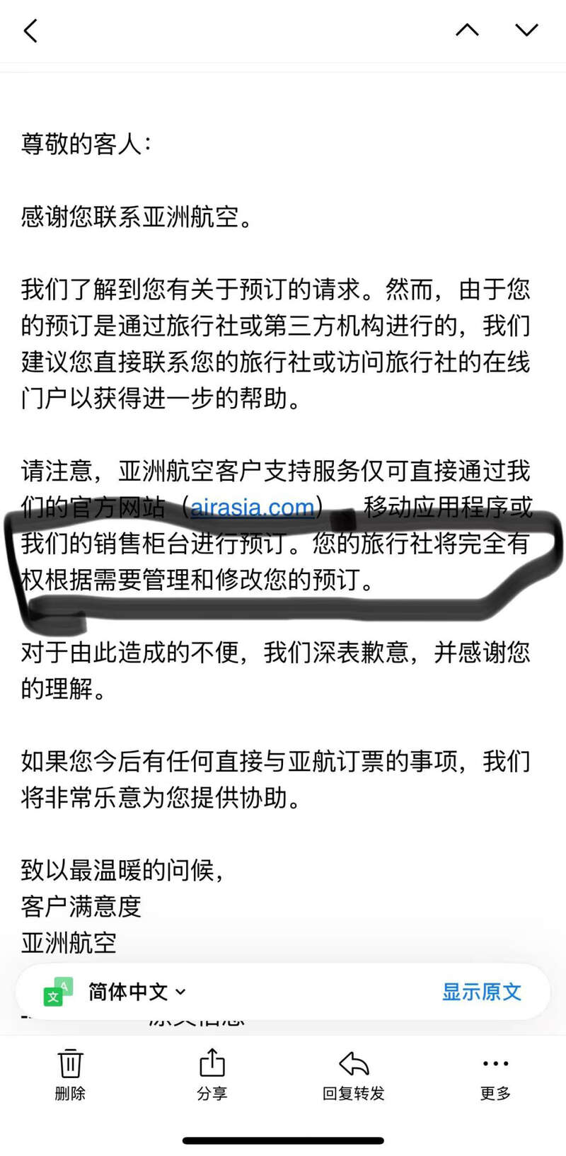 发现问题后,葛女士立即联系了去哪儿网。要求更改乘机信息或退票,但平台表示无法退改。之后,葛女士还通过亚航官网询问了客服,对方表示错误太多无法更改。葛女士通过亚航邮件表示这是中文拼音和英文的区别,并不是更换乘客。亚航的回复邮件显示,对方称,“旅行社(第三方机构)将完全有权根据需要,管理和修改您的预订”。