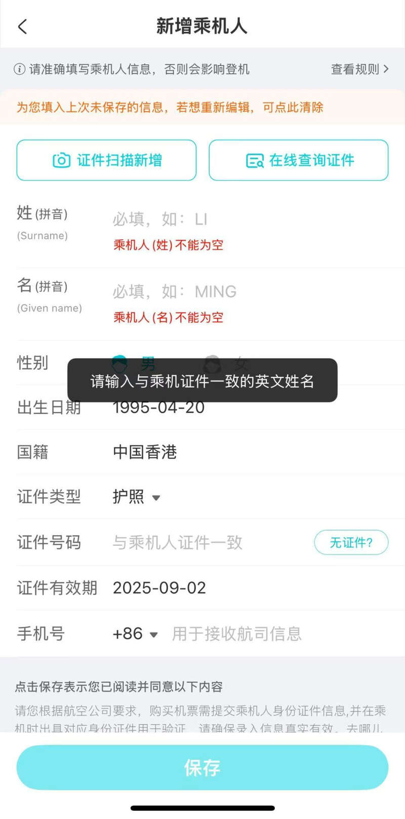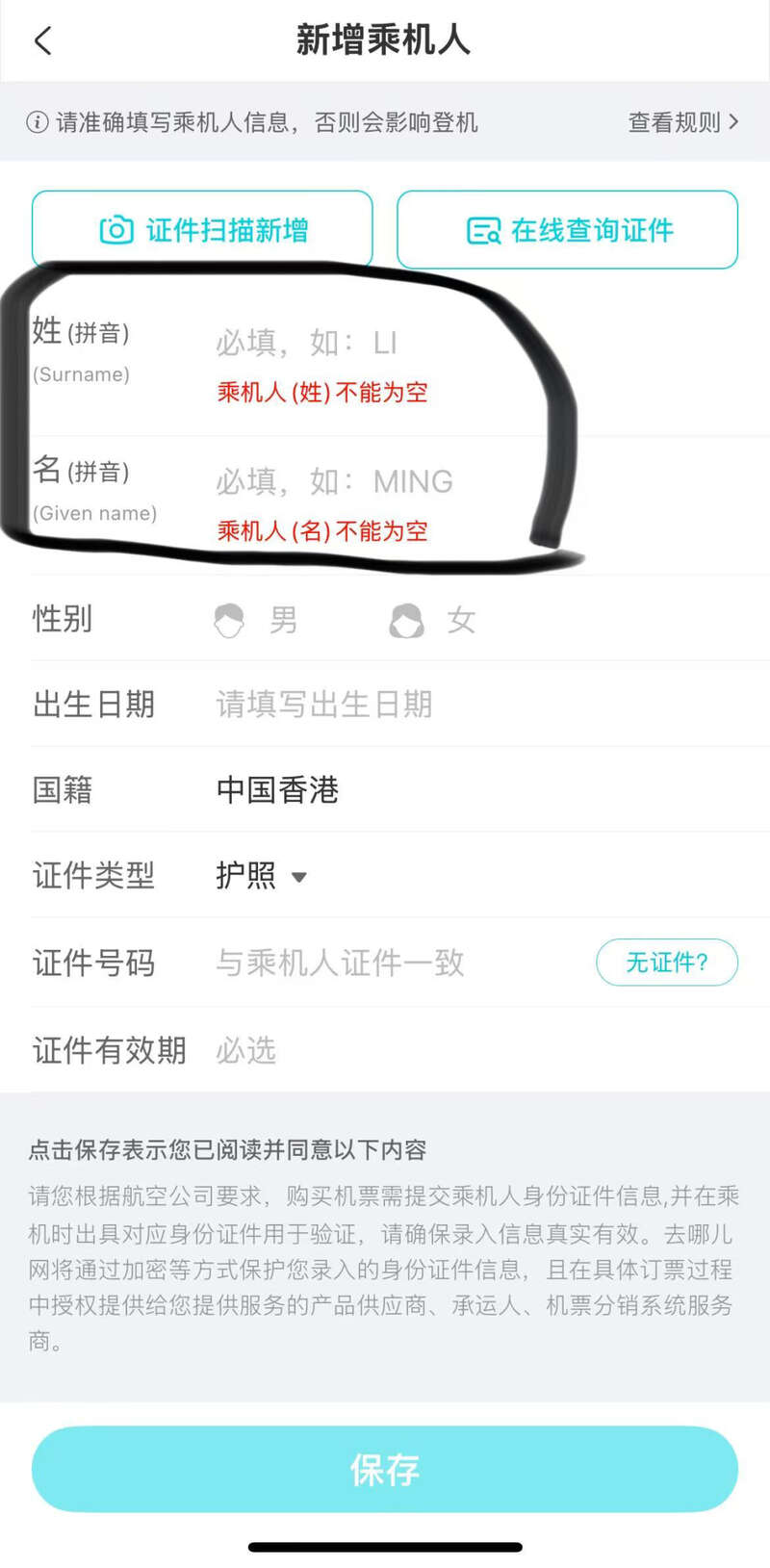 葛女士说,她为朋友购票时注意到增加旅客信息一栏的旁边要求填写拼音,她便填写了朋友的中文名拼音。但实际上,葛女士朋友使用的为香港护照,护照英文名与中文拼音并不一致。