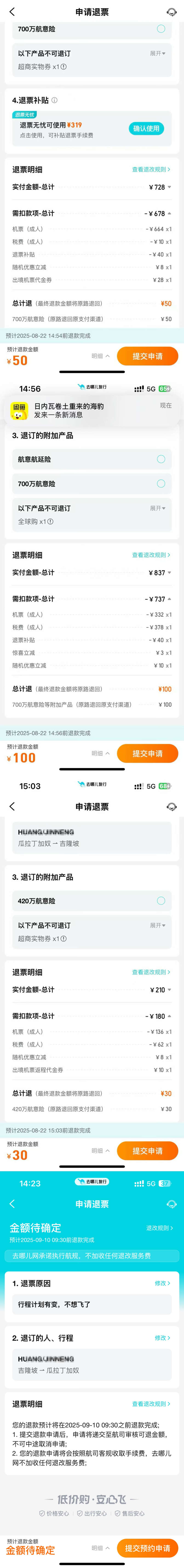 据葛女士介绍,她因打算与友人一同出国旅行,便于2025年8月18日在去哪儿网平台帮朋友订购了4张国际航班机票,分别为9月6日从香港到吉隆坡、9月7日从吉隆坡到瓜拉丁加奴、9月9日从瓜拉丁加奴到吉隆坡和9月10日从吉隆坡到香港,总计花费两千余元。