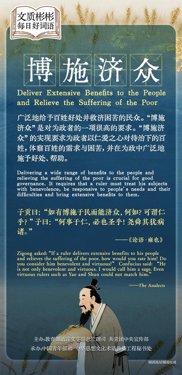 广泛地给予百姓好处并救济困苦的民众。“博施济众”是对为政者的一项很高的要求。“博施济众”的实现要求为政者以仁爱之心对待治下的百姓,体察百姓的需求与困苦,并在为政中广泛地施予好处、帮助。做到“博施济众”的为政者即具备了“圣”的德性。