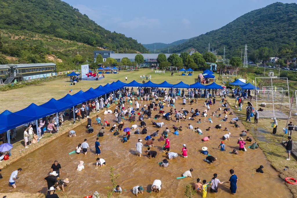 2025年9月6日,在安徽省芜湖市繁昌区平铺镇茶冲村一家庭农场,游客在参加乡村摸鱼大赛(无人机照片)。