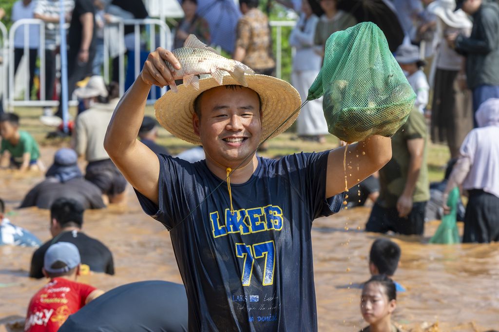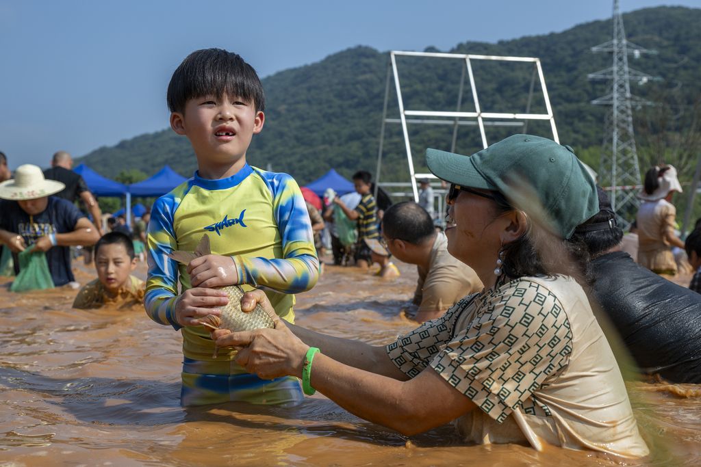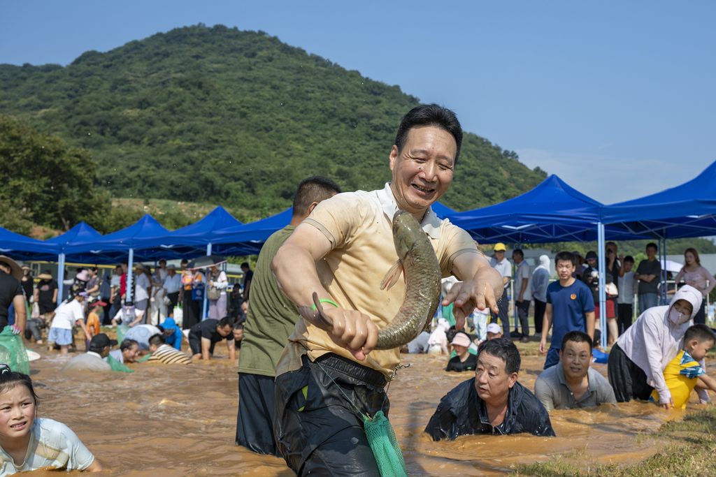 2025年9月6日,在安徽省芜湖市繁昌区平铺镇茶冲村一家庭农场,游客在参加乡村摸鱼大赛。
