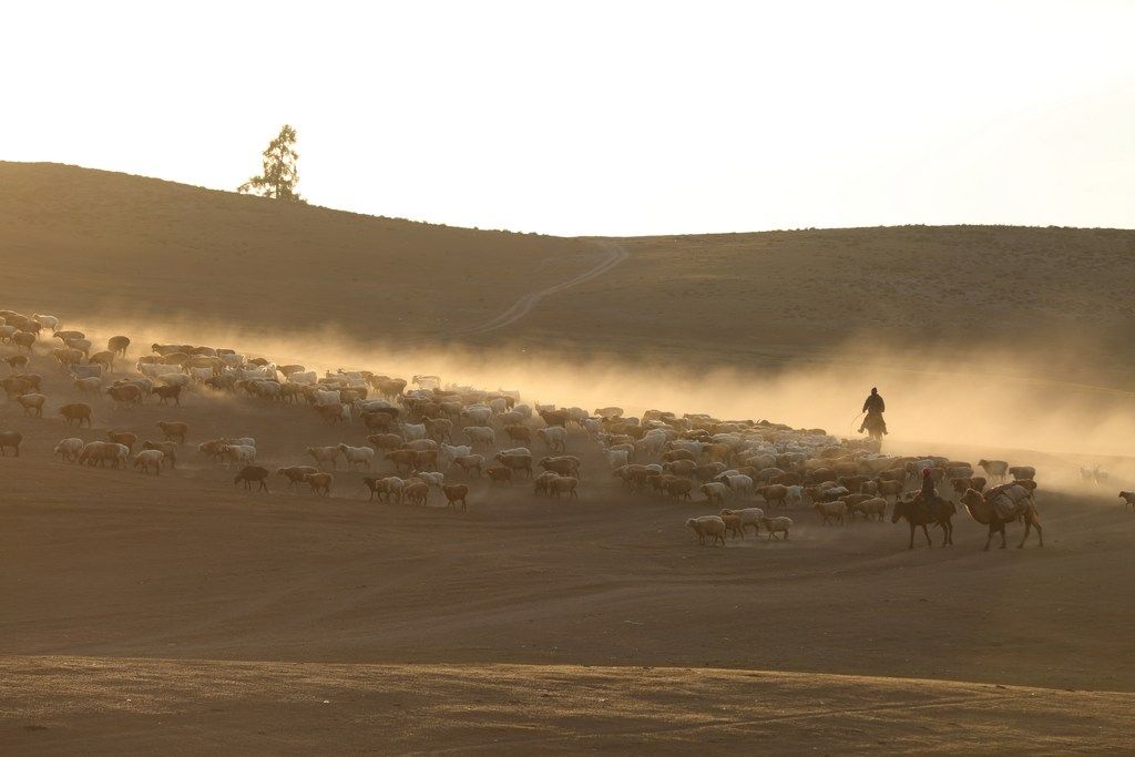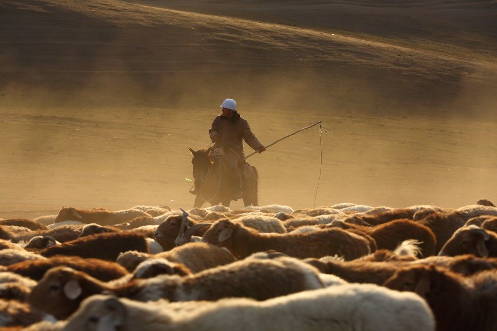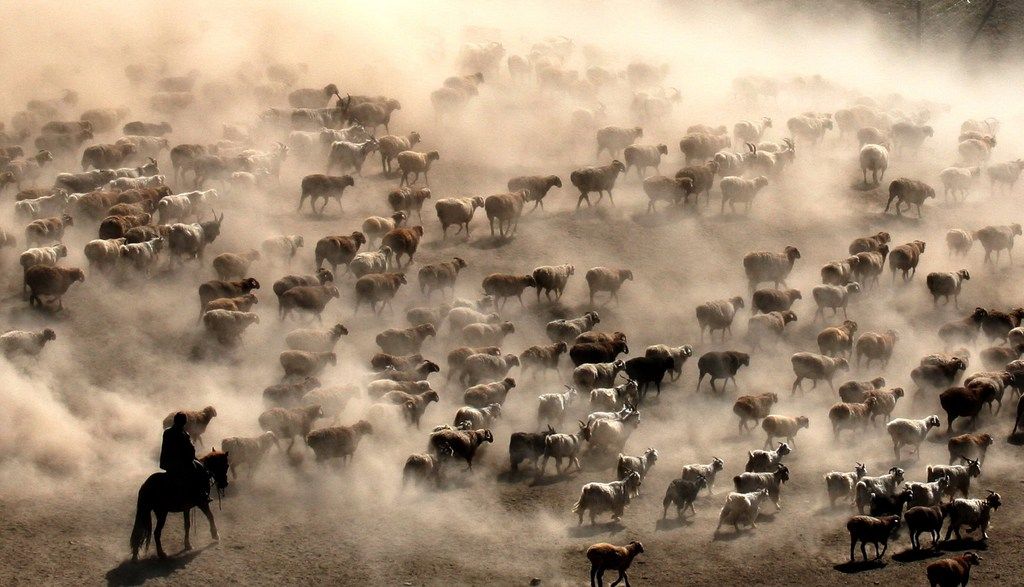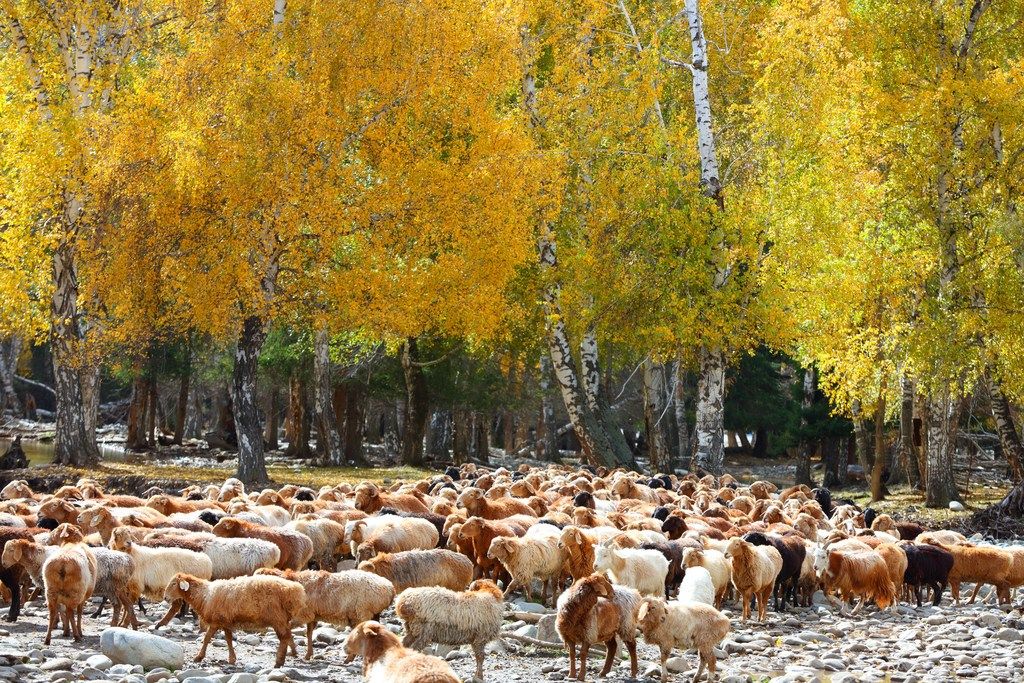 2025年9月5日,新疆哈巴河县,牧民赶着牲畜前往冬牧场。