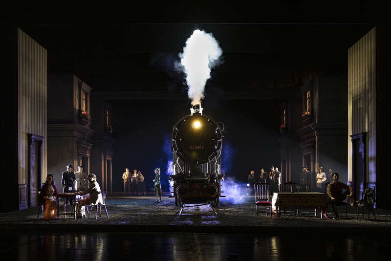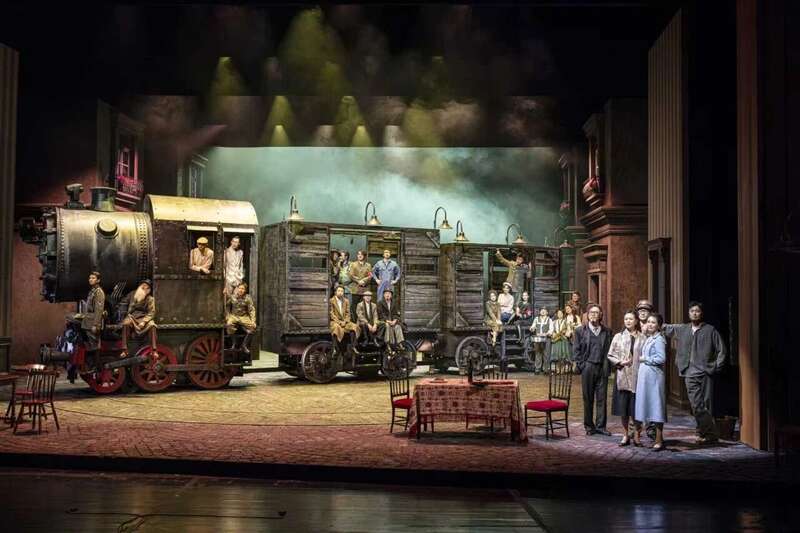 新版《屠夫》的舞台设计也令人惊喜。舞台上最亮眼的装置,是一列老式蒸汽火车。舞美设计结合曹禺剧场独特的“品”字形舞台结构,充分利用纵向空间,让火车随着剧情推进在台上行进、旋转。庞大而森冷的火车带来强烈的压迫感,恰如那个年代战争所带来的动荡不安在人们心中投下的深深恐惧。