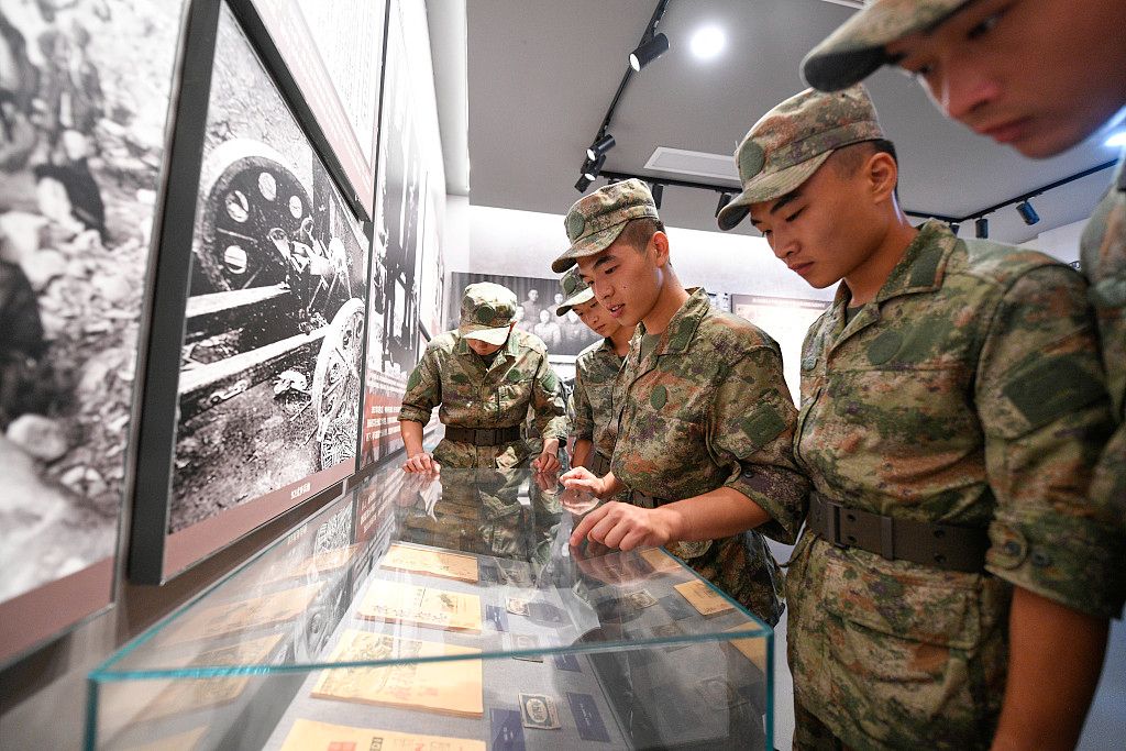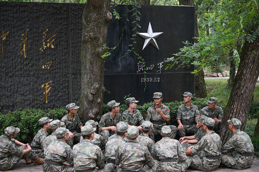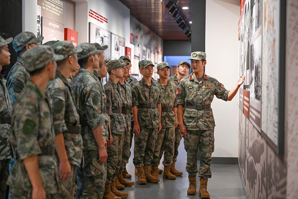 2025年9月6日,安徽庐江,在位于安徽省庐江县境内的新四军江北指挥部纪念馆,庐江县人武部组织预定新兵开展红色教育实践活动。连日来,安徽省庐江县人武部结合役前教育训练,开设“红色课堂”,通过参战老兵话军旅、实地参观战斗旧址等红色教育实践活动,引导广大预定新兵传承红色基因,进一步坚定从军报国的理想信念。
