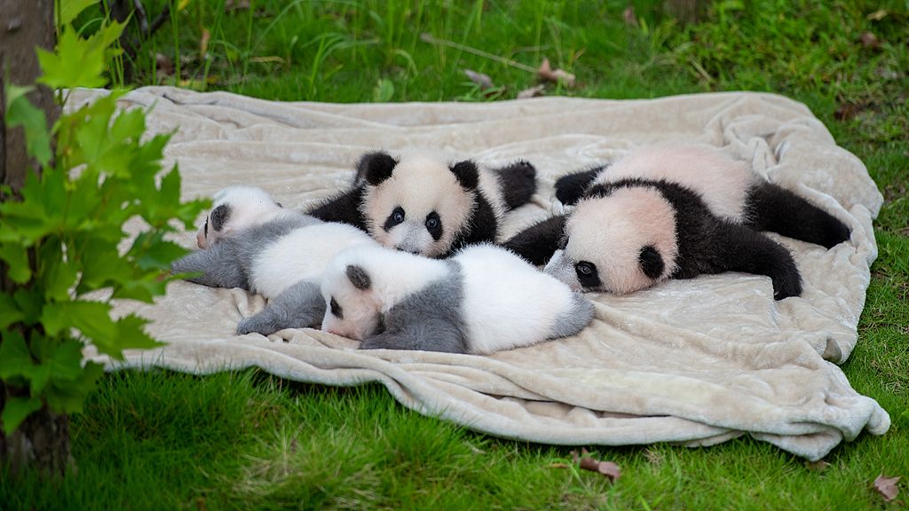 成都大熊猫基地新生幼崽“组团”晒太阳