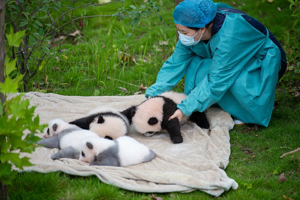 2025年9月6日,成都大熊猫繁育研究基地,今年出生的熊猫幼崽在饲养员精心照料下公开亮相。熊猫基地的露天活动场,奶妈怀抱毛茸茸的熊猫宝宝,轻轻将其放置在铺好软垫上。