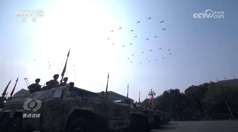 蓝天之上,轰鸣声持久不息,由26架直-19型武装直升机组成的“80”字样编队向天安门飞来,寓意纪念中国人民抗日战争暨世界反法西斯战争胜利80周年。