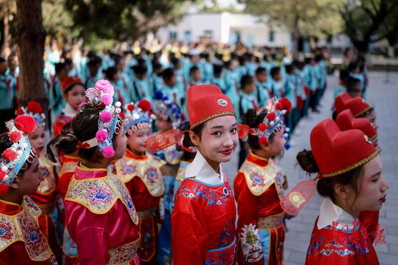 9月8日,新疆伊宁巴彦岱镇巴彦岱村“王蒙书屋”,小学生们准备登台表演豫剧。中青报·中青网记者 曲俊燕/摄