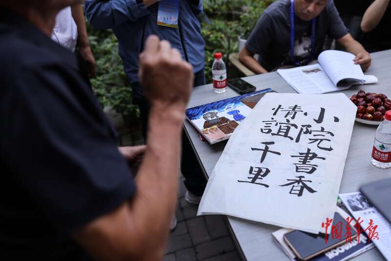 9月8日,新疆伊宁巴彦岱镇巴彦岱村,“云花居”民宿的经营者刘雄拿出了由前来研学的上海小学生写的书法作品。今年夏天,3名上海小学生跟随老师和家长来到巴彦岱村,与当地的小朋友一起开展了阅读分享活动。中青报·中青网记者 曲俊燕/摄