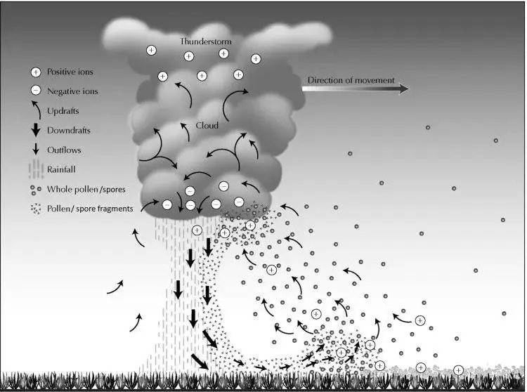 雷暴发生前,气温骤降、大风呼啸,会把地面的花粉、霉菌颗粒“卷”到云层里。