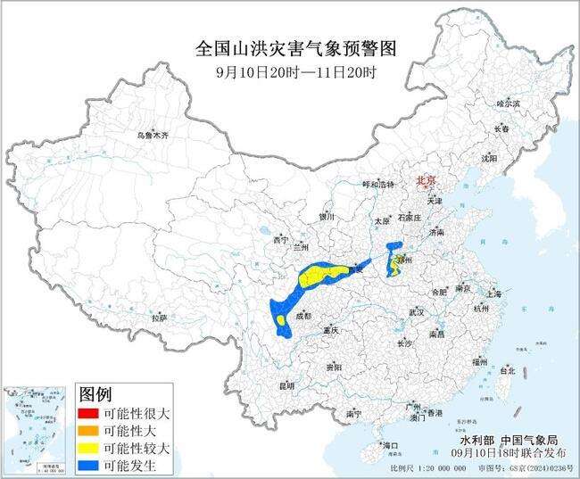水利部和中国气象局9月10日18时联合发布橙色山洪灾害气象预警:预计,9月10日20时至11日20时,河南中西部、四川中部和北部、陕西西南部、甘肃南部等地部分地区发生山洪灾害可能性较大(黄色预警),其中,河南中西部局地发生山洪灾害可能性大(橙色预警)。其他地区也可能因局地短历时强降水引发山洪灾害,请各地注意做好实时监测、防汛预警和转移避险等防范工作。