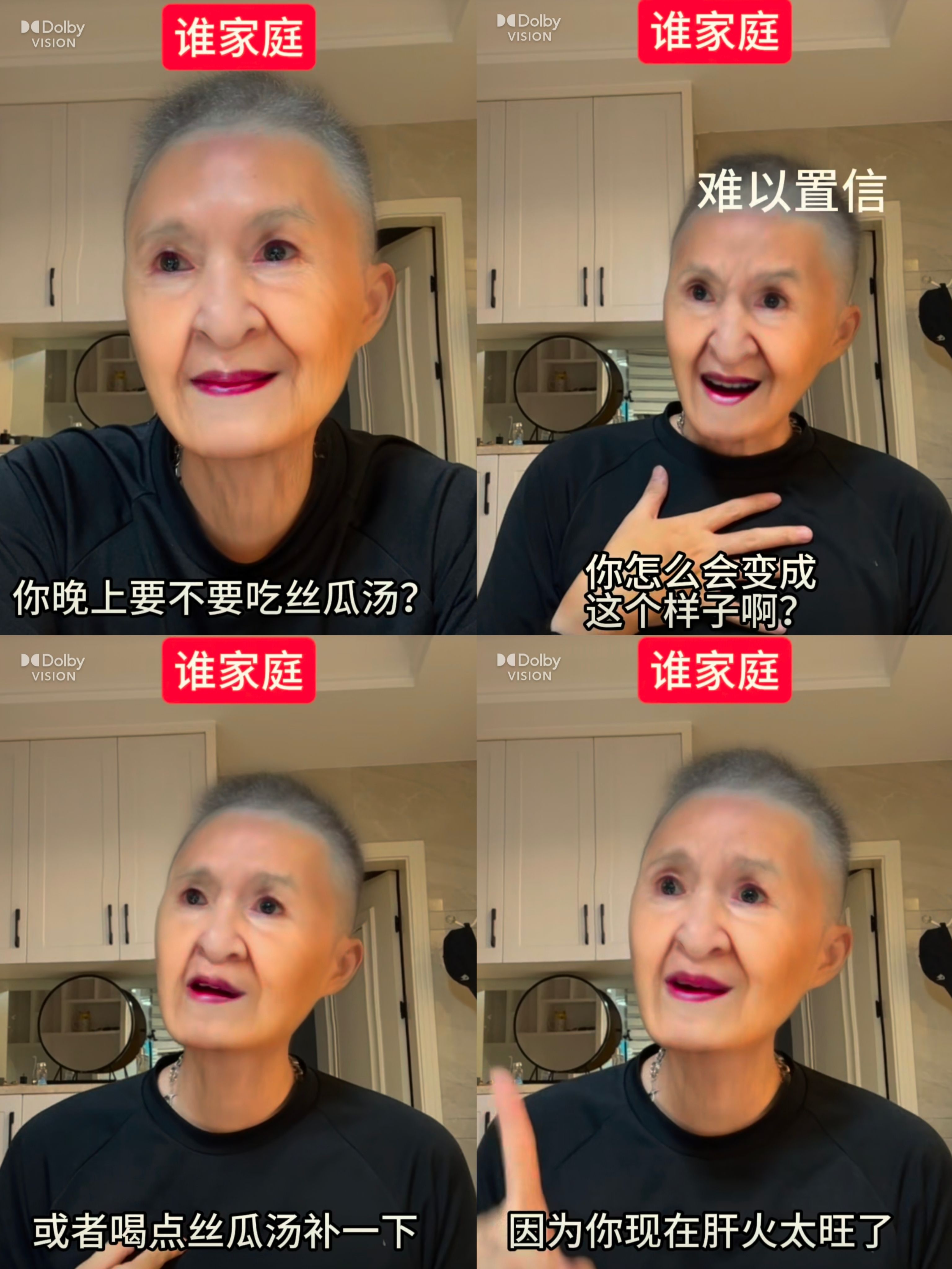 这段看似“魔性”,却又相当贴近现实生活的对话,源于博主@累子 不久之前发布的一则搞笑视频。视频中,博主利用换脸特效,一人分饰母子两角,围绕一碗丝瓜汤展开攻防,上演了一出“母要子喝,子不得不喝”的家庭伦理大戏。对此,许多网友都被其离谱的对话、生动的表演、搞怪的特效逗得乐不可支;然而,也有不少网友由此联想到自己的家庭关系,大呼“谁在演我家”,感到哭笑不得。某种程度上,“丝瓜汤”之所以能成为全网热传的“爆梗”,也正是因为它在搞笑之外,激起了众多年轻人对亲子关系、代际对话等问题的思考与共鸣。