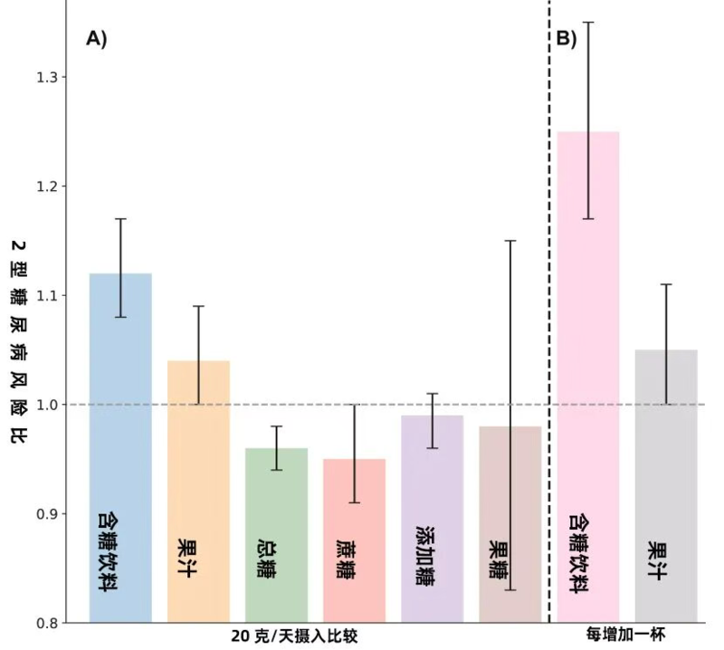研究团队以20克糖为基准,统计了不同来源的糖对2型糖尿病的影响。(即便研究团队已经排除了体重指数、总热量摄入和其他生活方式因素的干扰,喝进去的糖带来的风险依然非常明显)
