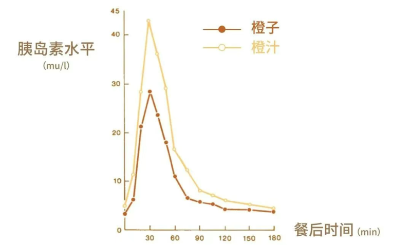 一项研究比较了吃橙子和喝橙汁对血糖代谢的影响,发现即便是吃下去的糖一样多,喝橙汁刺激胰腺分泌的胰岛素,几乎是吃橙子时分泌的2倍!