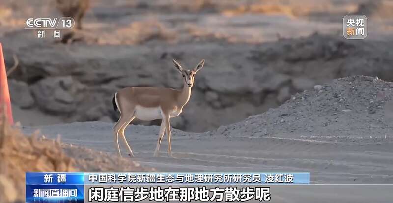 中国科学院新疆生态与地理研究所研究员 凌红波:黄羊不怕人了,闲庭信步地在那儿散步呢。这就是人与自然和谐相处。