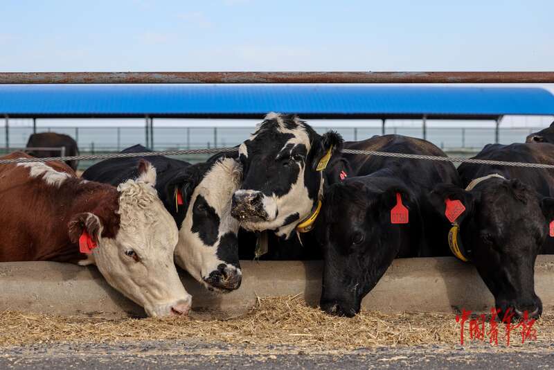9月10日,新疆博尔塔拉蒙古自治州博乐市,新疆天莱农牧集团股份有限公司养殖场,新疆褐牛、安格斯牛,以及天莱自主培育的“熊猫牛”等品种的牛在进食。中青报·中青网记者 曲俊燕/摄