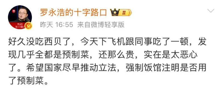 9月10日,罗永浩发文吐槽著名连锁餐饮品牌西贝莜面村:“好久没吃西贝了,今天下飞机跟同事吃了一顿,发现几乎全都是预制菜,还那么贵,实在是太恶心了。希望国家尽早推动立法,强制饭馆注明是否用了预制菜。”随后西贝工作人员回应称,牛大骨是每天现煮的,莜面也是店内工作人员现场手搓的,不存在预制。另外,店内的炒菜每天都是新鲜的蔬菜到店,现场炒制。