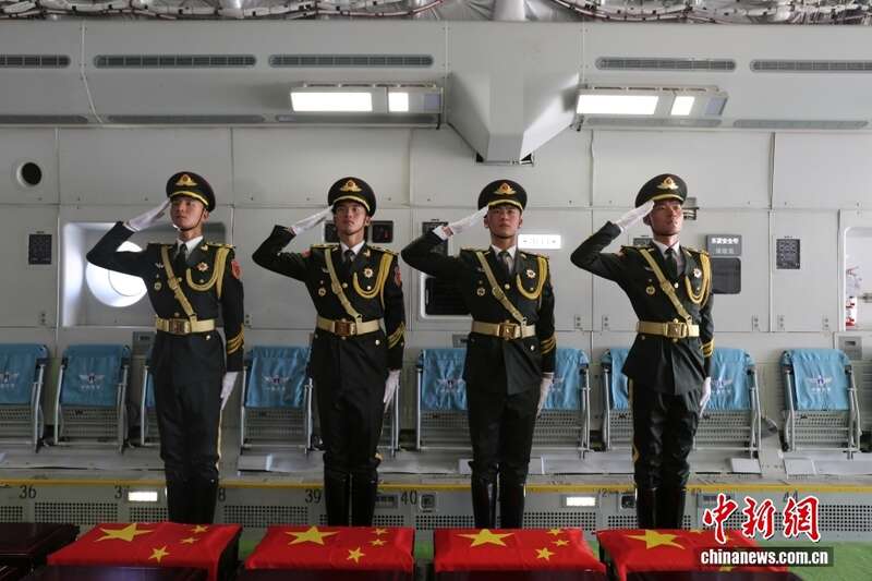 据中国驻韩国大使馆消息,9月12日上午,中韩双方在韩国仁川国际机场共同举行第十二批在韩中国人民志愿军烈士遗骸移交。退役军人事务部副部长马飞雄及代表团成员,中国驻韩国大使戴兵及使馆外交官,中资机构、华人华侨、留学生代表参加。活动开始后,全体中方人员奏唱国歌,戴兵大使为志愿军烈士遗骸棺椁一一覆盖国旗,全体参加人员向烈士遗骸行三鞠躬礼,表达深切哀思和崇高敬意。之后,中国人民解放军仪仗司礼大队礼兵护送英烈遗骸棺椁登上空军“运-20”专机启程回国。图为中国空军运-20机舱内礼兵面向志愿军英烈棺椁敬礼。