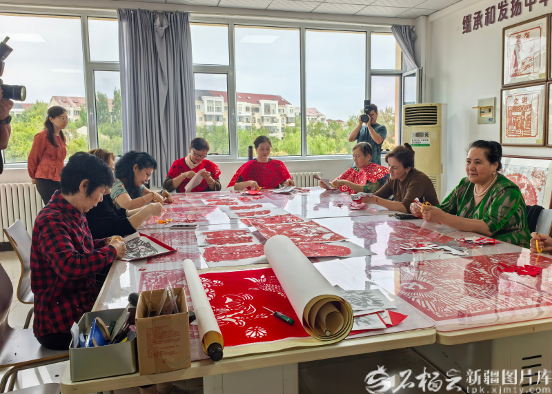 9月13日,在克拉玛依市克拉玛依区昆仑街道南苑社区,居民在剪纸。石榴云/新疆日报记者于江艳 摄